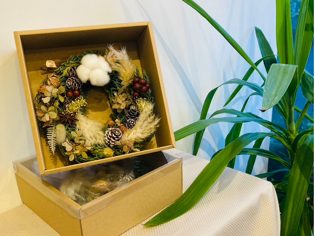 お持ち帰り用の箱に入れてお渡しします。そのまま飾っておくこともできます。