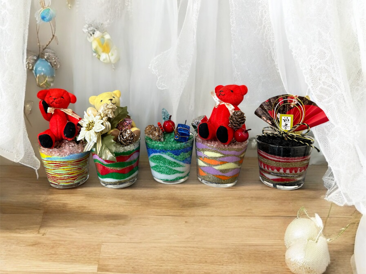 たくさんの色のお砂から自分の選んだ色の砂を使ってスプーンで模様をつけていきます!上の飾りはアーティフィシャルフラワーや、ディフューザー、観葉植物から選べます!