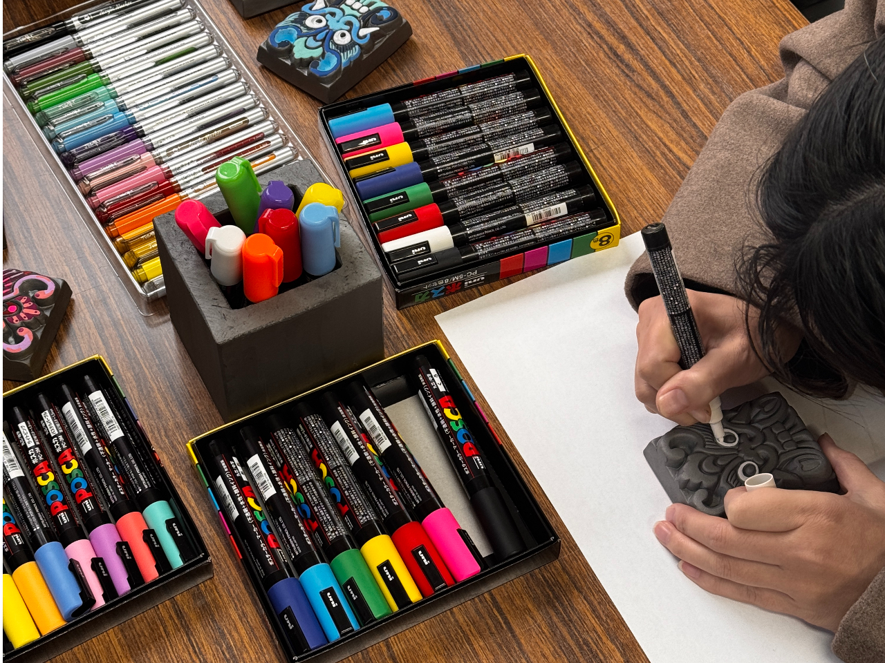 古代鬼瓦に絵付けができます。アクリルマーカーで絵付け体験後はすぐにお持ち帰りいただけます。