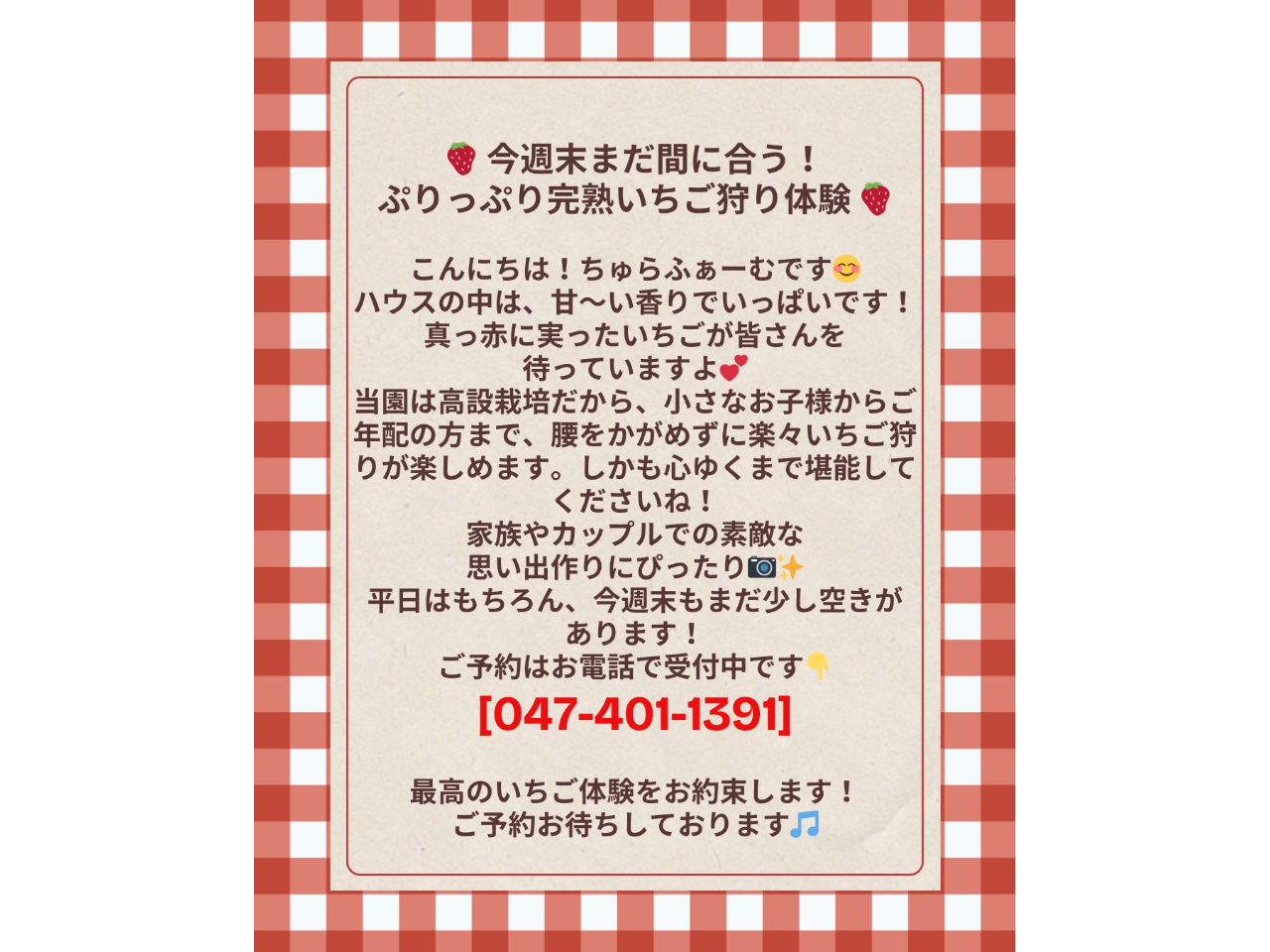 どこのイチゴ狩りに行こうか迷っている方がいたら、自信を持ってオススメできる施設です。白を基調としたとても綺麗なイチゴ農園です。入り口に入ると靴を履き変える仕様なので靴下持参、脱ぎやすい靴がオススメです。注意事項の動画を視聴した後ハウスへと案内されます。ハウス内は椅子やテーブルがあり摘んだイチゴを椅子に座って食べる仕様でした。制限時間は40分でしたが、美味しいイチゴを食べながらの楽しい時間であっという間でした。いちごは品種も多く、沢山実っていて飽きずに食べられます。驚くほど大きいものから小ぶりで食べやすいイチゴまで様々で本当に美味しかったです。練乳やチョコレートも+100円ずつで購入したので色んな変化を楽しみながら食べられました。娘を連れて行きましたが皆さん子どもに対しても優しくて、親切で温かな接客が印象的でした。気さくに話しかけてくださり嬉しかったです。友人や知人など色んな方にオススメしたい素晴らしいいちご農園でした。ありがとうございました。リピートします!詳細情報をみる