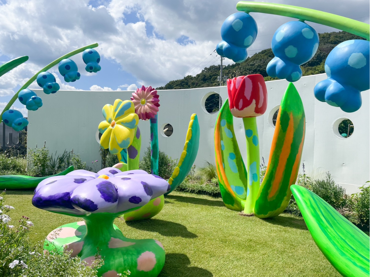 瀬戸内国際芸術祭出展作家大宮エリー氏の巨大な触れるフラワーアート!アート作品の下でこびとになった気分で写真が撮れる♪ アート作品にふれ、四季の花々や虫に囲まれ子どもの創造力が育まれる庭育ガーデン!