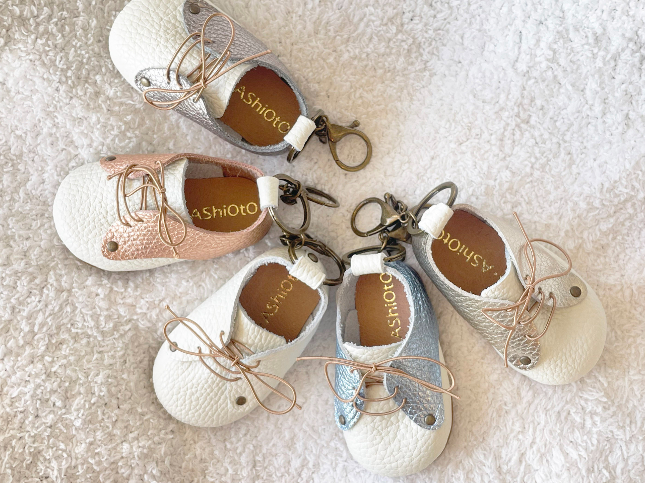 仕上がった靴はキーホルダーとしてもお使い頂けます、新生児が実際に履ける大きさとなっております。