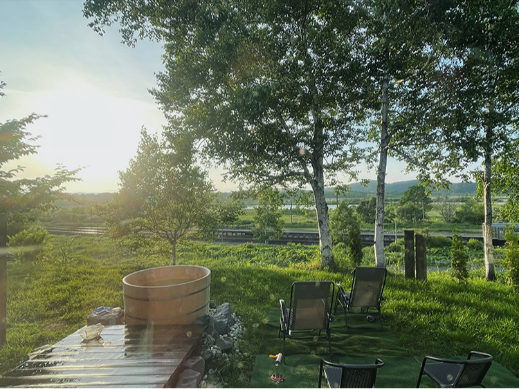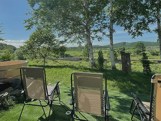 眼前にそよぐ白樺の枝葉を見上げながらの外気浴