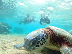 「海亀遭遇率99%。初心者でも安心の少人数制シュノーケル。写真無料、3歳から参加OK」