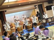 さて、いざ演奏が始まると宴会場は轟音で包まれ、正直お食事どころではないのではないかという雰囲気。..とは裏腹に3曲目からは和太鼓の演奏体験となり、さすがは管樂團というだけあって、リズム感もバッチリ!!お客様も入り乱れての楽しい演奏交流となりました。