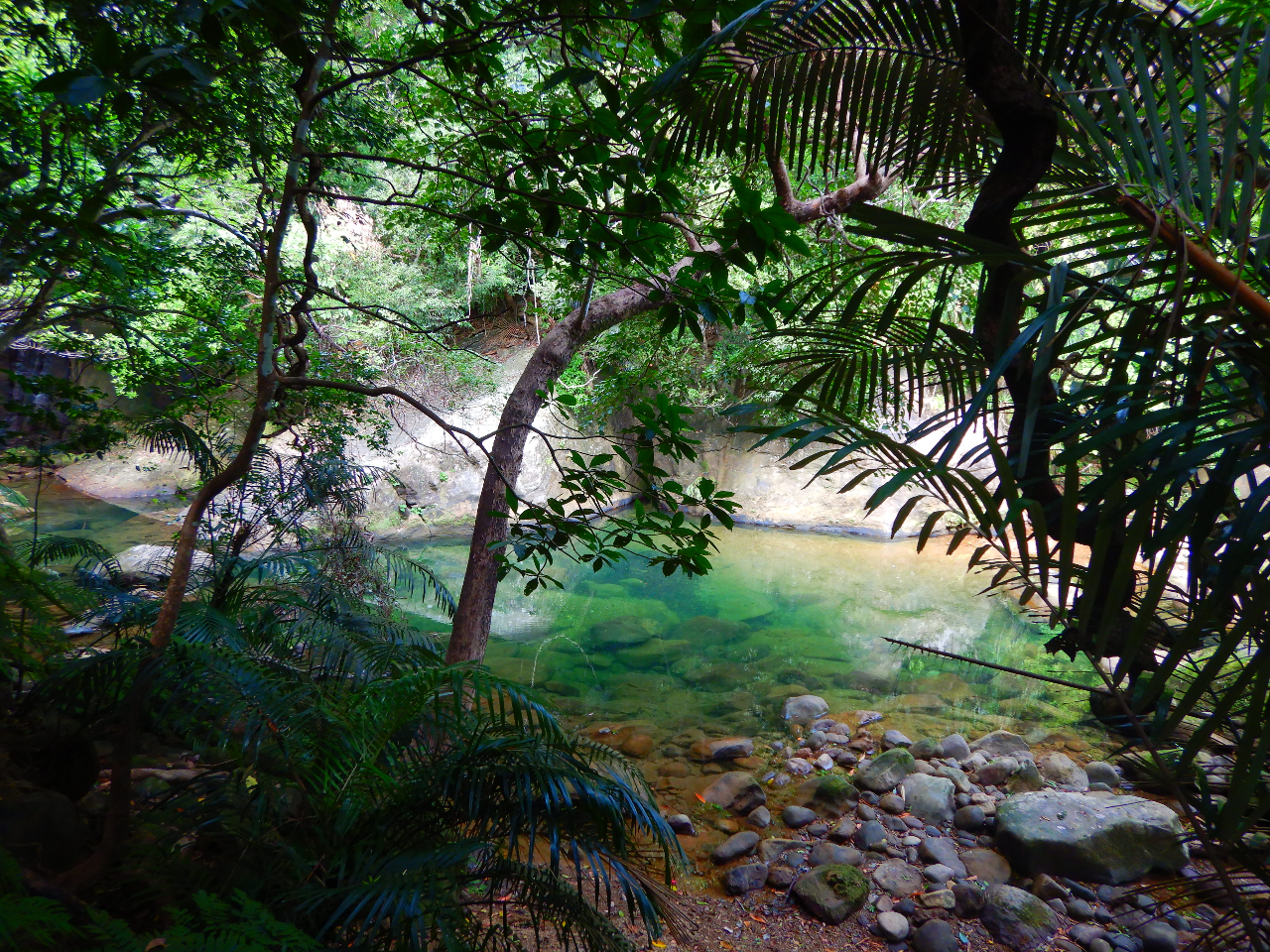 【モダマ池】15分ほど歩いて行くと目的地のモダマ池に到着。透明度は高く、暖かい時は泳げます。カヌー・カヤック
