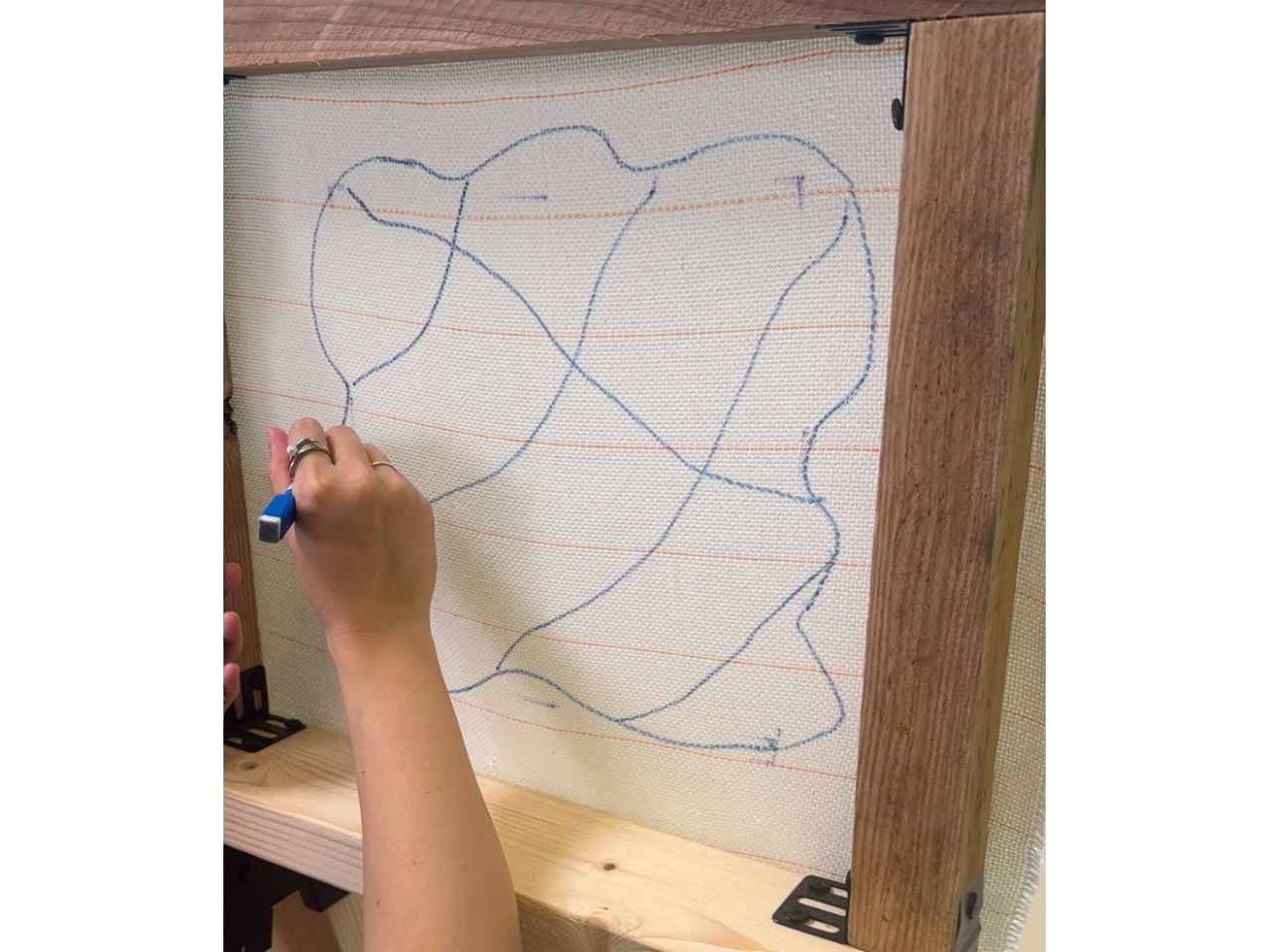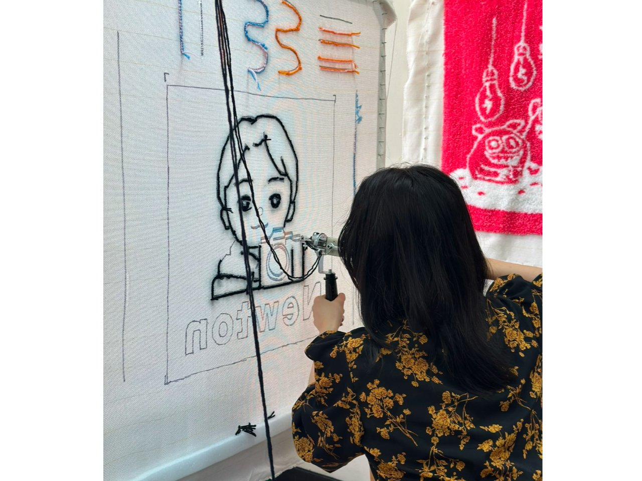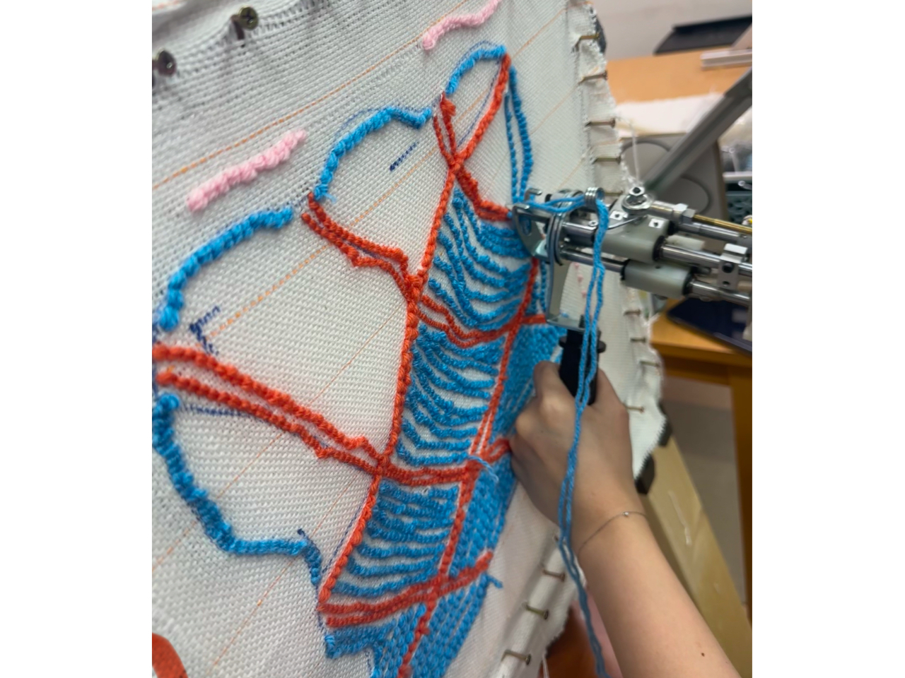 Bデザインを布に移し、タフティングガンで布に毛糸を打ち込む