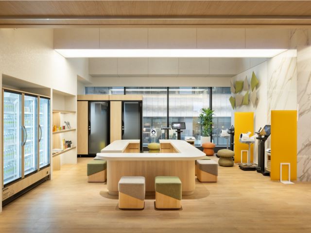 [4階 センターラウンジ] ウェルビーイングのイメージを反映させた開放的空間。飲食スペースとしても利用可能で、ゆったりとした時が流れます。