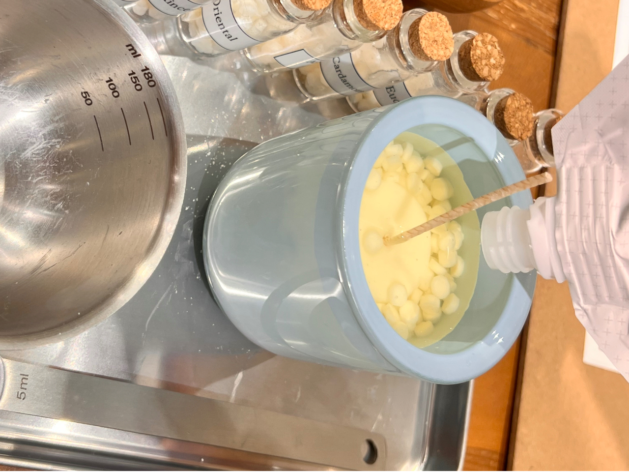 湯せんして温めた生キャンドルパックを調香したグラスに注ぎ、約15分ほどでキャンドルが完成します。