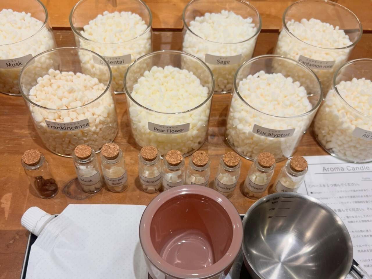 店頭スタッフが丁寧にサポートしますので、初心者の方でも安心してご参加いただけます。キャンドル作り(アロマキャンドル等)