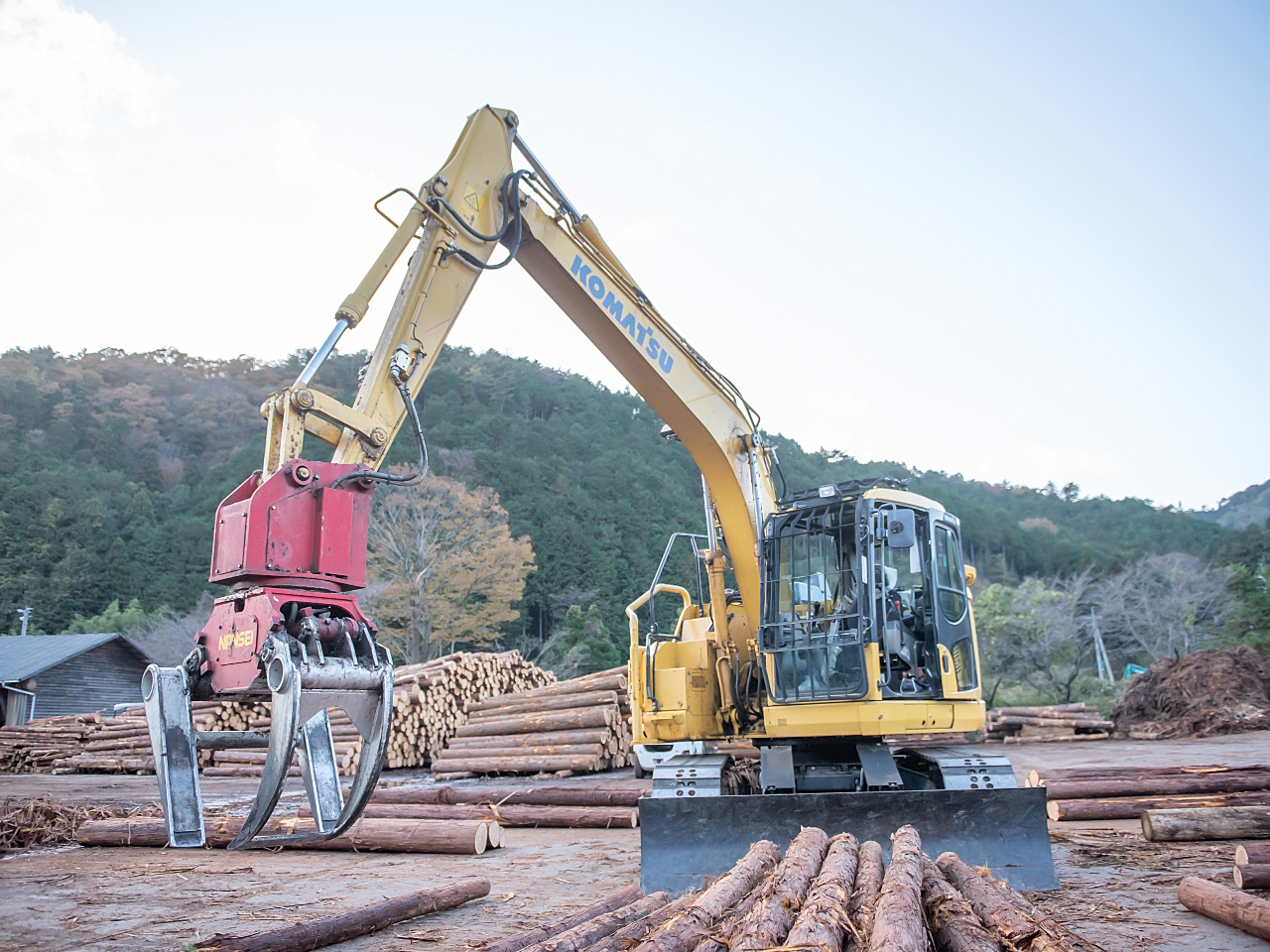 Bグラップルを操縦して丸太を積み上げたり、移動させたりする