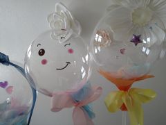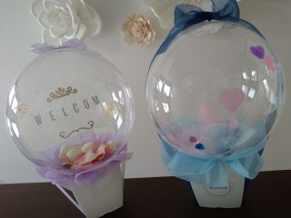 花びらや羽根をバルーンの中に入れてスティックバルーンか置き型バルーンが作れます。
