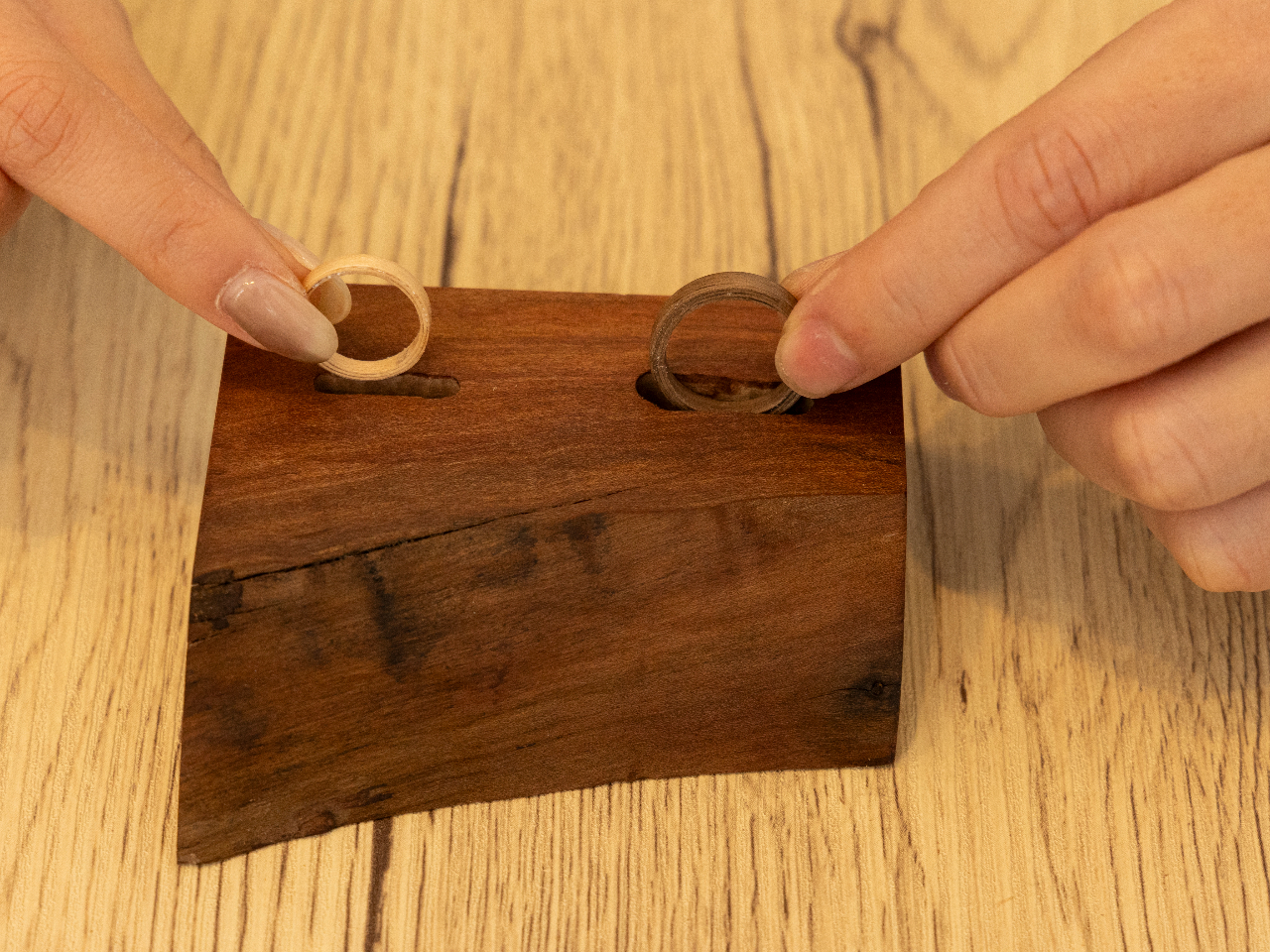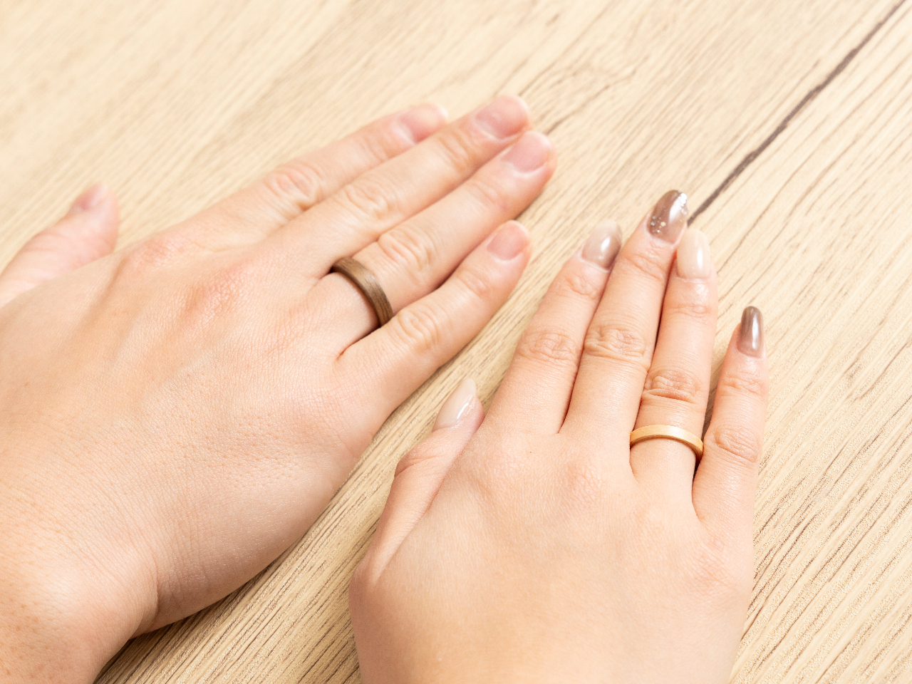 温もりを感じる木材は自然素材であるため、触れると金属とは違い、優しい温もりを感じられます。心地よい感触が落ち着いた気持ちにさせてくれるのが魅力。 また、木目の模様は一つとして同じものがないため、リングのデザインが自然に唯一無二になります。 そのため、他の人と被らない特別感を感じます。 また、金属製のリングよりも圧倒的に軽いので、長時間つけていても疲れにくい。 特に普段アクセサリーをあまりつけない方にもおすすめです。金属アレルギーが心配な方でも安心して使える点が魅力!