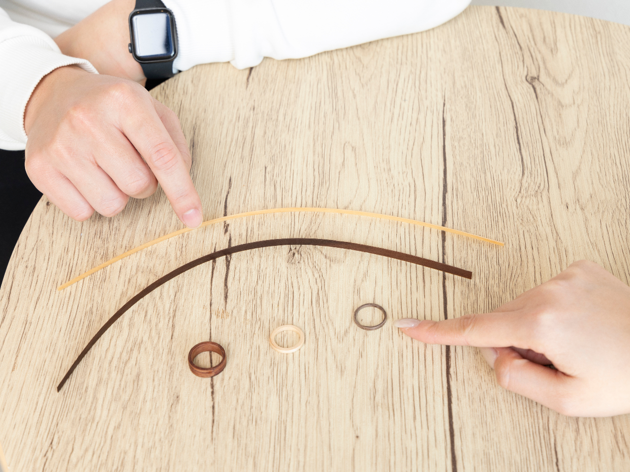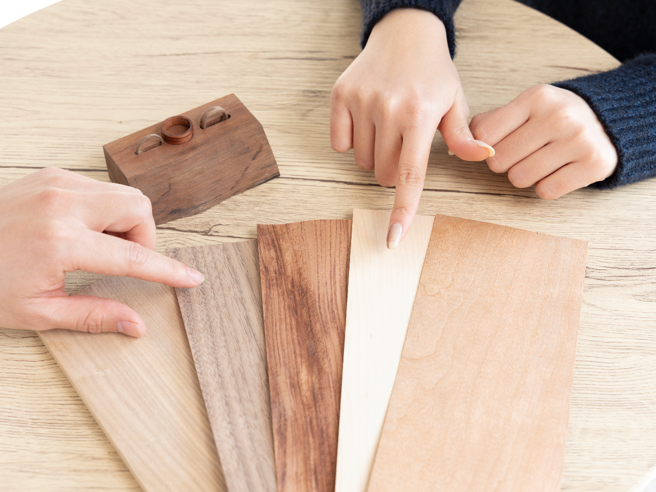 ・5つの樹種からサンプルや木言葉を確認し、自分のリングで使用する樹種を選択できる