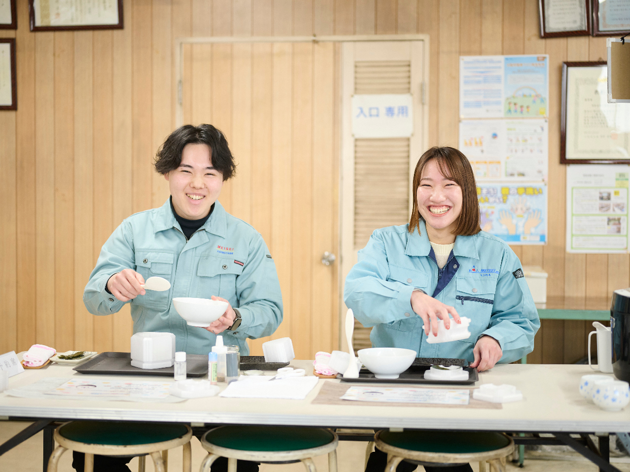 明星金属工業鰍ヘ、大阪府大東市に本社を構える金属加工・製造企業です。主に、車のプレス金型を製造しており、有名車種のボンネットやドアなどあらゆる部品を製造。「ものづくり大阪の代表」として地元産業を支える企業の一つとされています。金型は、材料を成形するための道具で、「凸(おう)」と「凹(へこ)」の部分が組み合わさることで、目的の形状を作り出します。プレス金型(板金加工用)の凸型(パンチ)は、材料を押し抜く事や曲げる役割、凹型(ダイ)は材料を受け止めるて成形する役割を持ちます。つまり、「凸」と「凹」がセットになっているのが金型!2つで1つになっているのが金型の基本とされます。そんな金型の特徴にヒントを得て、「凸」と「凹」がセットになった「飯盛おむすび型」を開発。大東市の観光名所のひとつ、「飯森山」は、飯(めし)を盛る(もる)山と書き、おむすびにもピッタリ!また、NHK朝の連続テレビ小説「おむすび」のロケ地にも大東市が選ばれていることなど、さらに自慢の社員食堂を備えていることなどから、おむすびづくり体験を考案。もちろん工場見学などから金型を学んで明星金属工業鰍ニのご縁をむすんでくださいね。