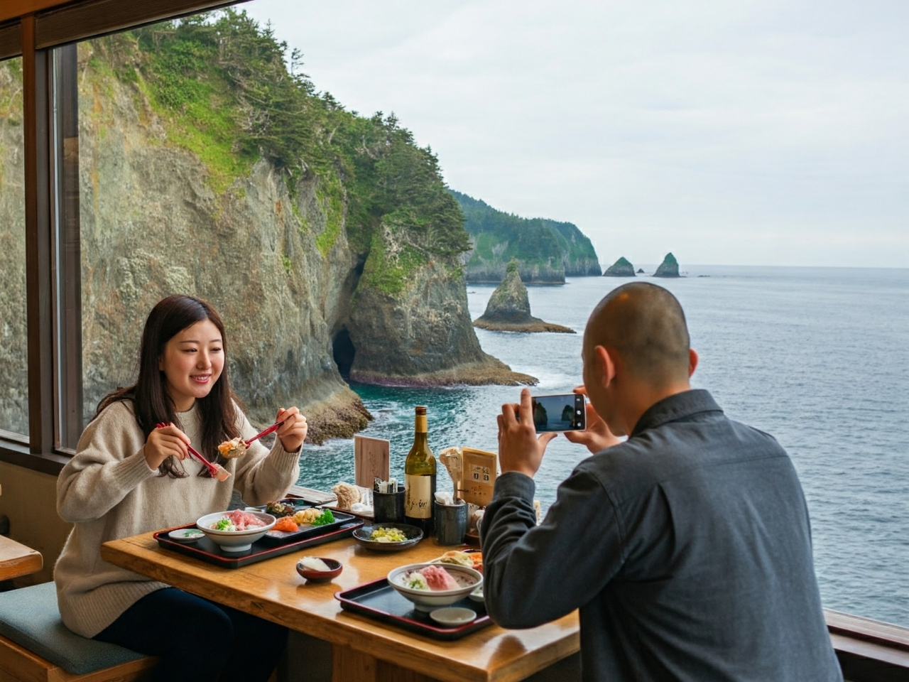 絶景を眺めながら海の幸を堪能する贅沢なひととき。窓越しの美しい景色が特別な食事を演出します。