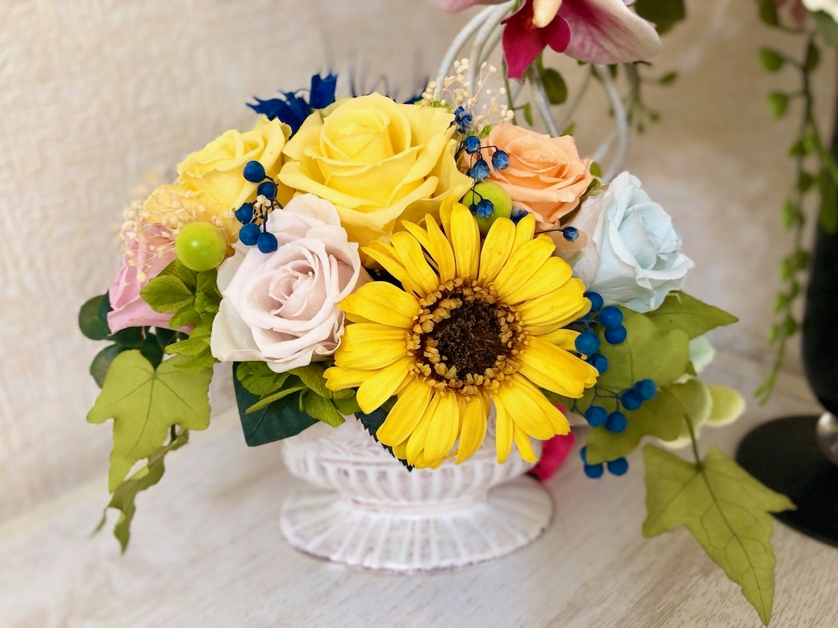 母の日は毎年カーネーションを渡してましたけど今年は自分でフラワーアレンジメントを制作して渡したいと思って華結美さんを予約して主人と2人で頑張って作りました。母の好きな色を取り入れて世界で一つの感謝の気持ちを込めたプレゼントが出来たと思ってます。これも先生が母の好きな色とか母との思い出などを聞いてくれたから作品に表すことが出来たように思います。ありがとうございました。母に渡した時もすごく喜んでくれて嬉しさと思い出の母の日になったと感じてます。