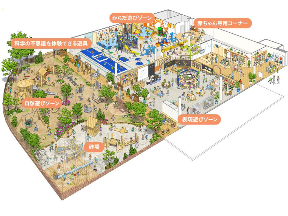 室内あそび場と屋外あそび場を組み合わせたプレイヴィル。あそびの「場」として重要な役割を果たす日本の公園をもっとたっぷり遊べて、もっと居心地の良い家族の居場所にしたいという願いを込めて開発しました。