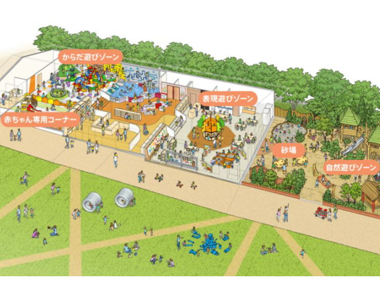 室内あそび場と屋外あそび場を組み合わせたプレイヴィル。あそびの「場」として重要な役割を果たす日本の公園をもっとたっぷり遊べて、もっと居心地の良い家族の居場所にしたいという願いを込めて開発しました。