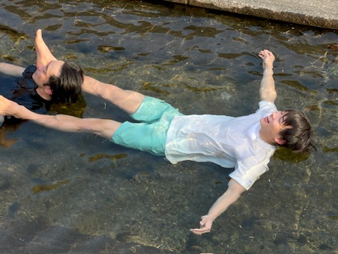 テントの目の前の小川にダイブして体を冷やしてください!