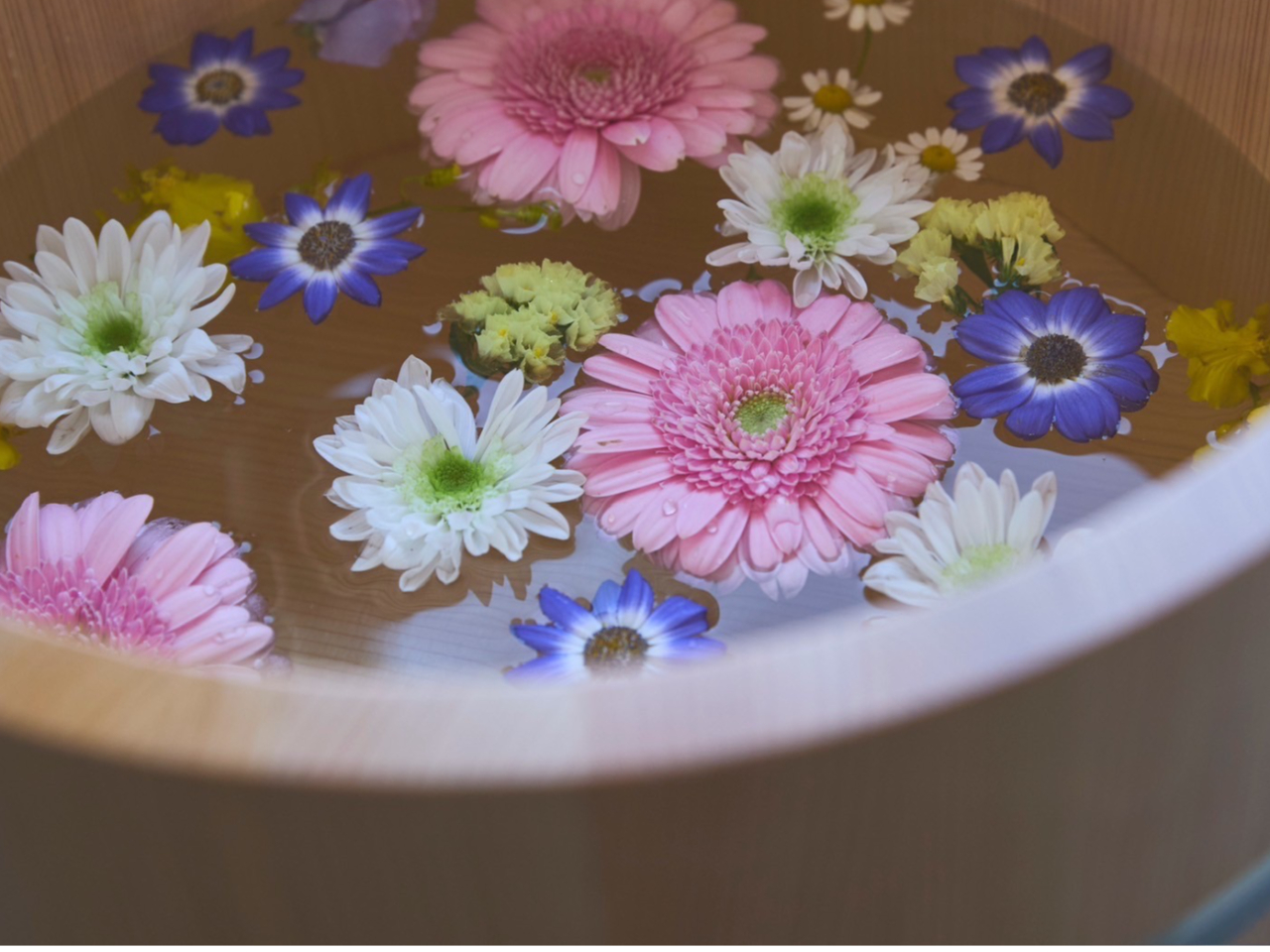 季節のお花を浮かべた足湯に浸かりながらほっと一息できるひとときをお過ごしください♪