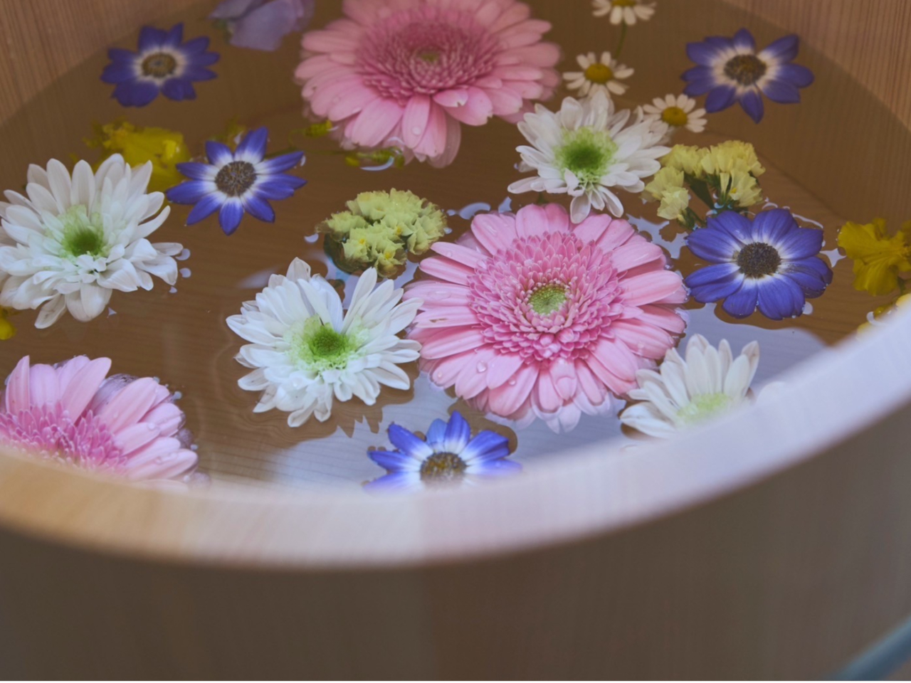 季節のお花を浮かべた足湯に浸かりながらほっと一息できるひとときをお過ごしください♪