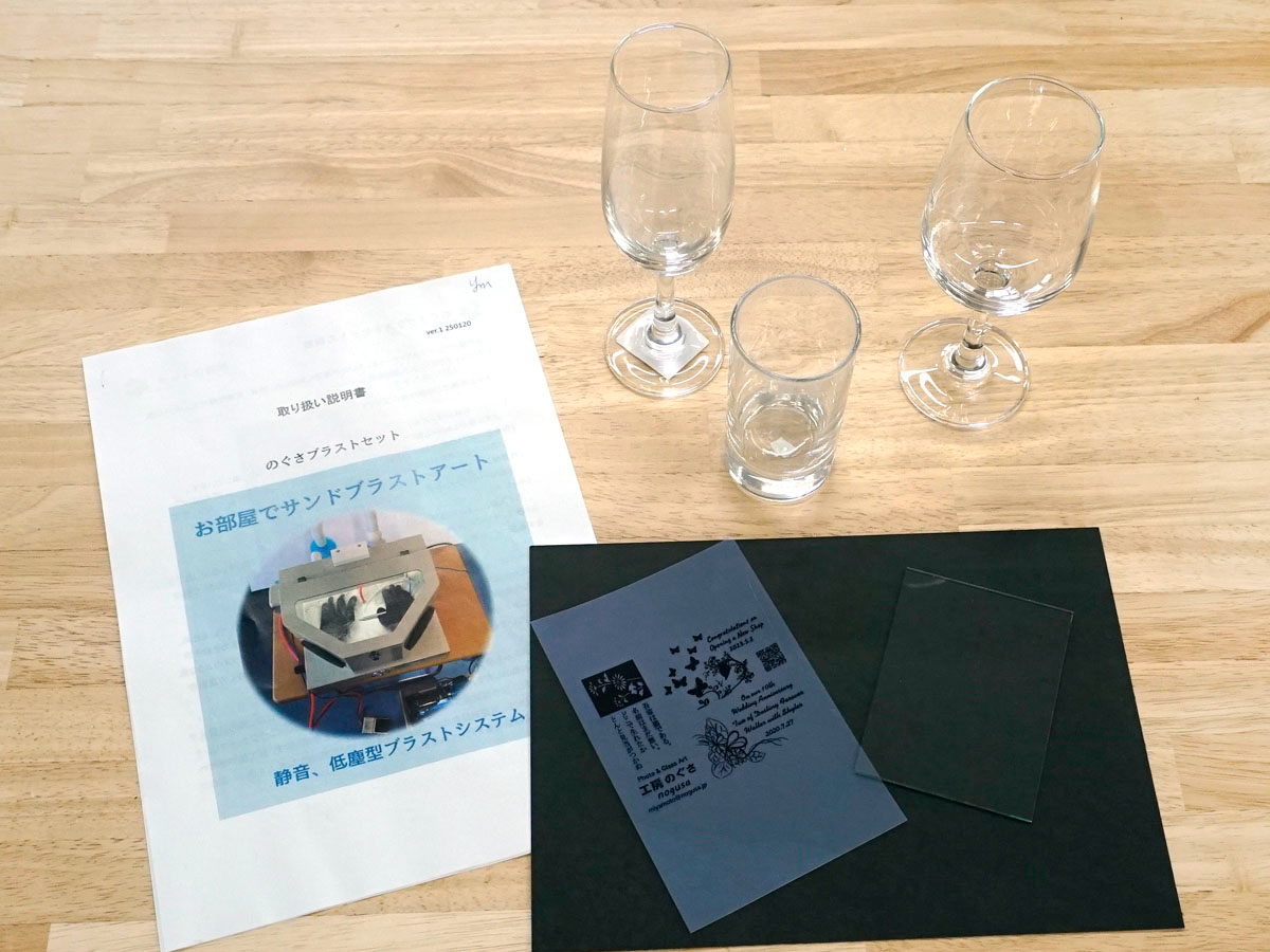低騒音、低塵仕様のサンドブラスト機器でサンドブラスト彫刻を体験頂けます。紫外線露光フィルムを使った彫刻用マスクをコンパクトな紫外線露光機で作製し、それをグラスに貼ったワークを用いてサンドブラストします。