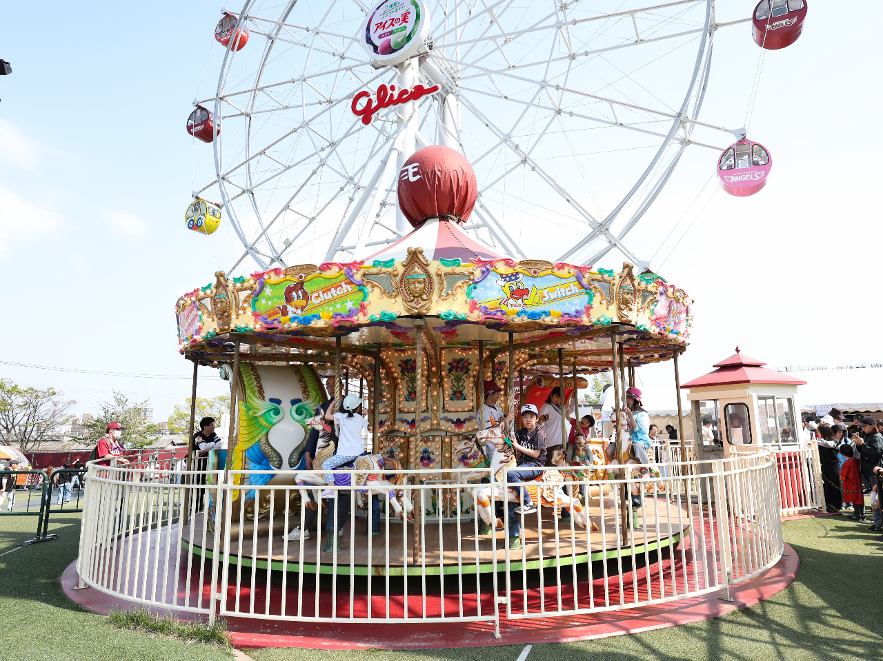 スマイルグリコパークは楽天モバイルパーク宮城レフト側後方の、観覧車やメリーゴーラウンドなどの施設がある、子どもからお年寄りまでお楽しみいただけるちょっとした遊園地です。