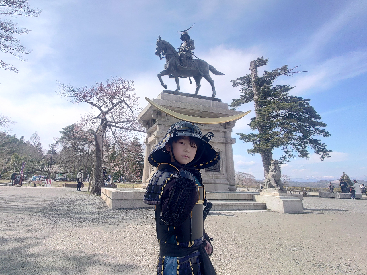 甲冑は子どもサイズと大人サイズがあり、甲冑姿で伊達政宗公の騎馬像や仙台の街並みをバックに記念撮影も可能です。