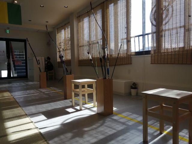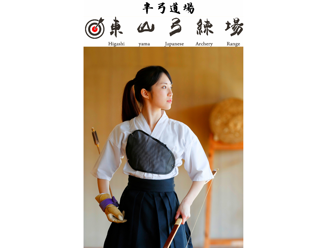 • 東山弓練場は室内弓術練習体験施設 半弓道場です。 弓道で用いる大弓の三分の二程の大きさである四半弓を用い『的は敵なり』を基本理念とし専ら的中精度を求める弓術です