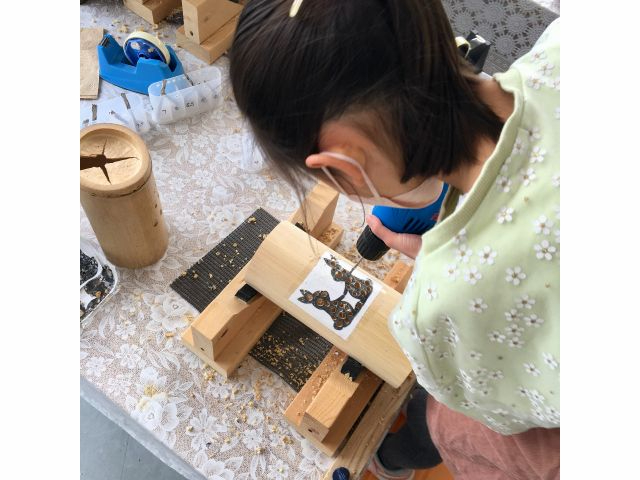 自分でデザインしたものを竹にチョークで書き、ドリルやのこぎりで穴をあけて灯りを創ります。