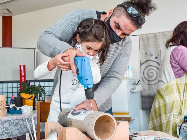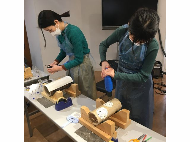 最初に道具の使い方をご説明いたします。 ドリルを使ったことがない方でも、安全に竹灯籠づくり体験を楽しんでいただけます。