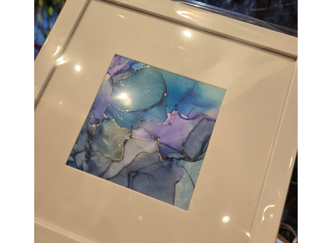 初めてアルコールインクアートをしました。彼氏との記念日だったのでお互いプレゼントができるようにと、それぞれ大きいフレーム用とと小さいフレーム用1つずつ作れました。先生とわいわい会話しながら楽しみ、とっても集中してしまうのでお菓子とお茶で休憩しながらゆっくり制作♪ 本番前に練習として何枚か作れるので、最後はお互い素敵な作品ができて大満足です!2人で大きい1つの作品を作るのも興味があるのでまた行きたいです♪
