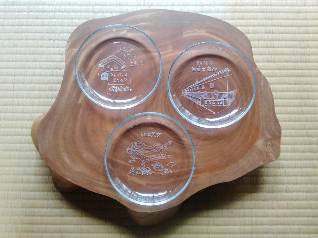 たまゆらではガラス皿にリューターという電動切削工具を使ってお好きな絵や文字を彫る体験ができます。
