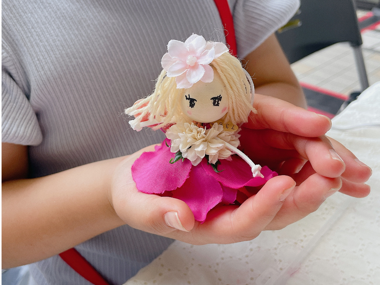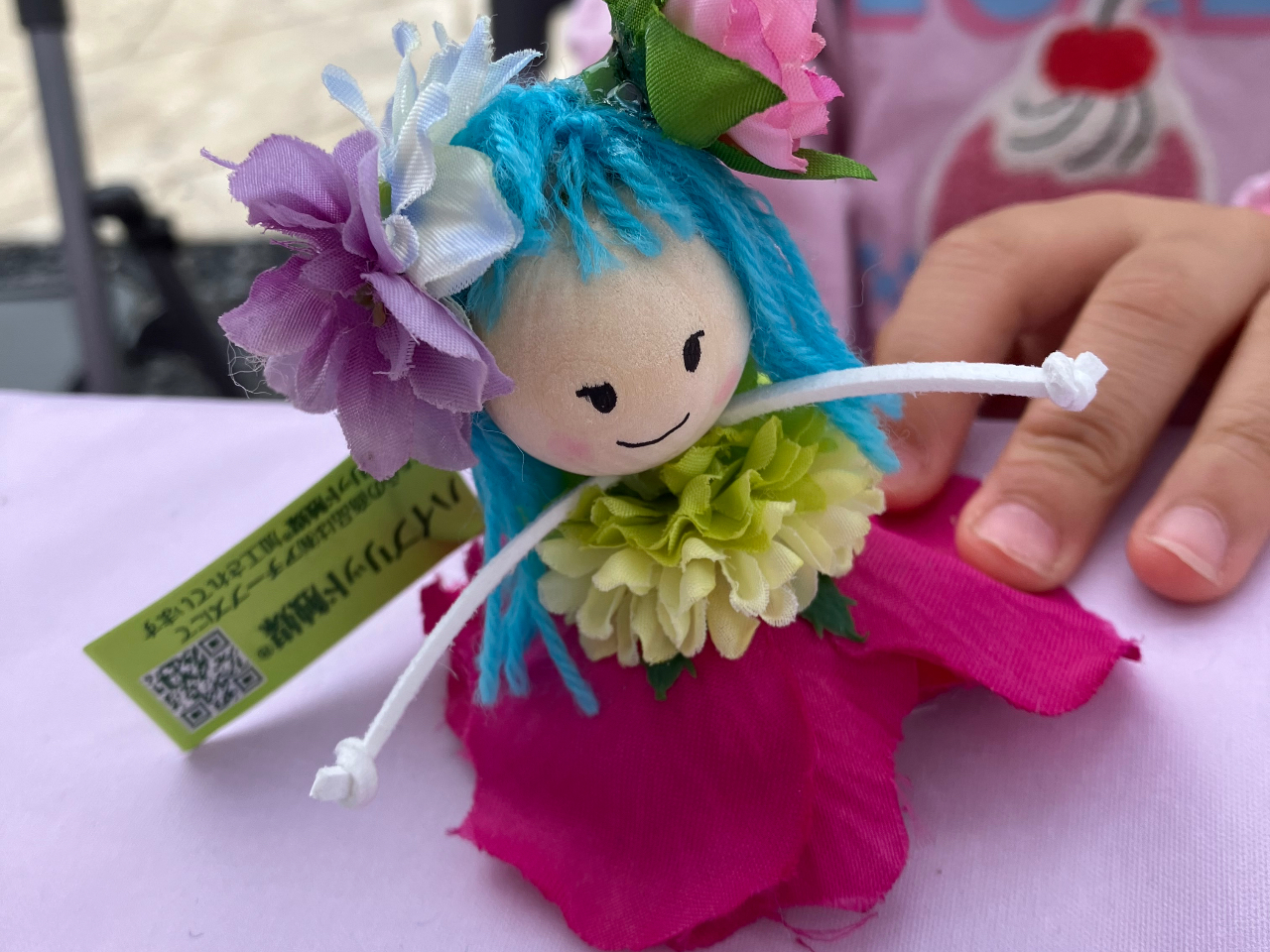 小さな体で働き者ポーリーンベルは消臭効果のあるカタリーヌフラワー(アーティフィシャルフラワー)のドレスを着たお人形です。消臭実験でその驚きの効果をその場で体感して頂くことも可能です。