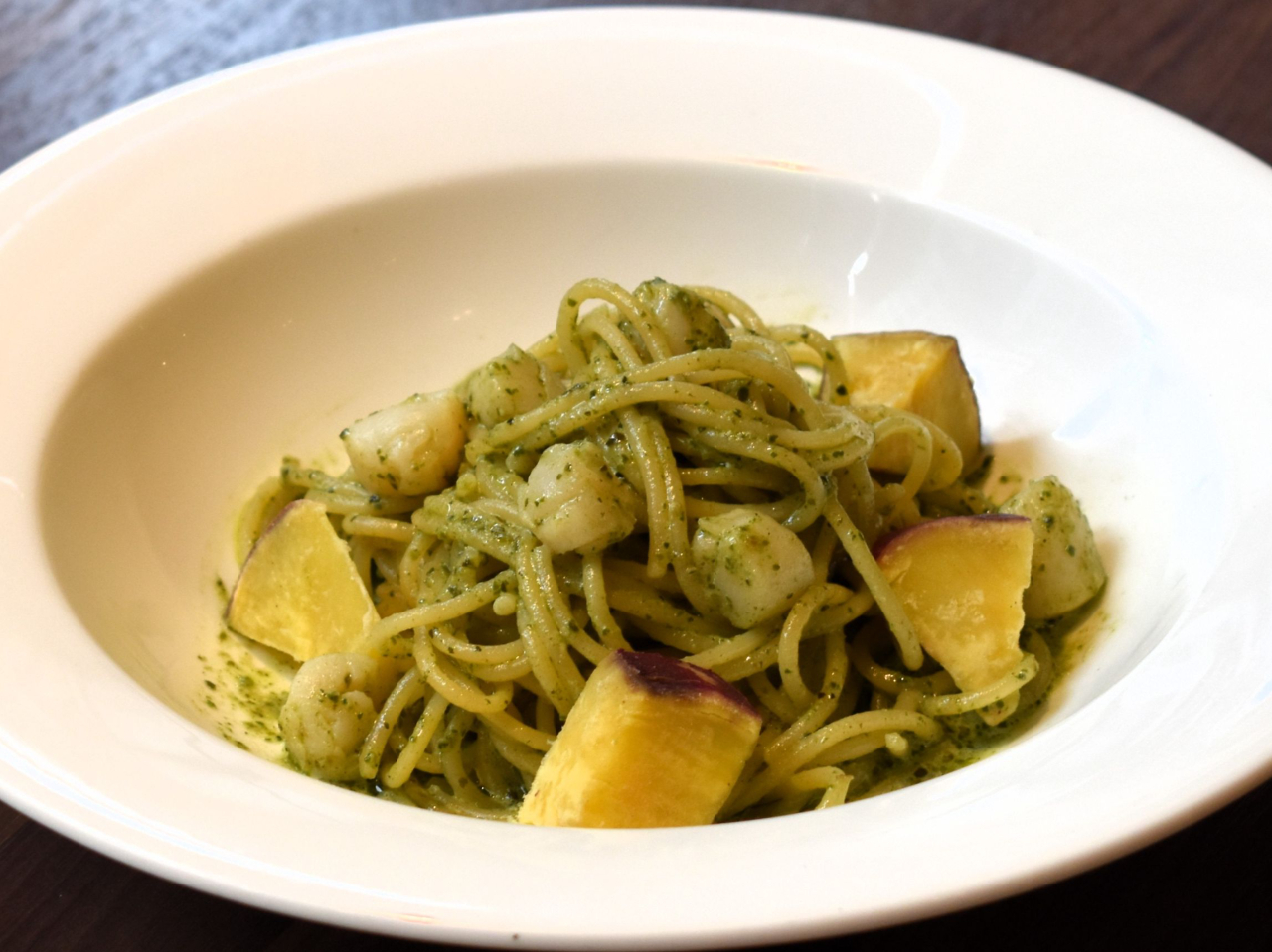 ・イタヤ貝とサツマイモのバジルクリームスパゲッティ