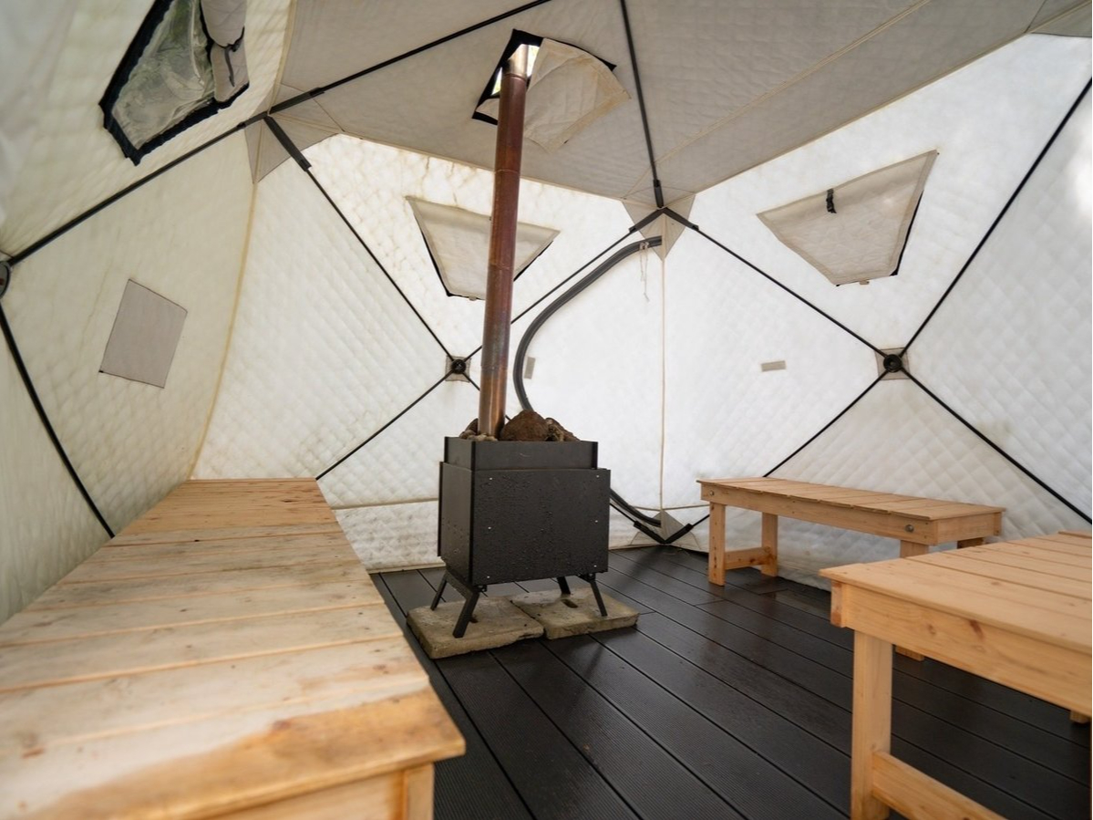 薪を組んで温度を上げていくテントサウナもございます!薪代は有料です