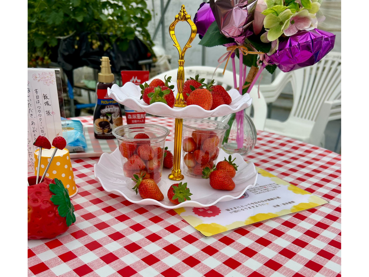 外が少し肌寒かったのでハウスの中での説明。卓上には手書きのウェルカムメッセージ。これすごく嬉しかったです!それとワクワクいちごパーティーということで、苺の被り物やサングラスまで用意してあり家族で被りました。笑