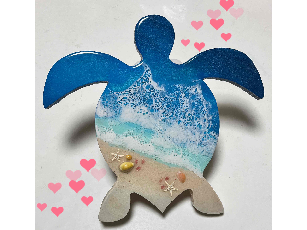 以前、他の所でA4サイズのレジンアートパネルを体験したことがありますが、初めてだったので夢中になっている間に終わってしまい、もっとやりたいという思いが残っていました。今回は、念願だったホヌ(ウミガメ)のアートパネルに挑戦!自分でもびっくりするくらい上手くできて、大大大満足です♪もうすでに、次は、何を作ろうかなぁと考え中です。看板犬のトントンにも癒されました〜。またぜひ伺います!