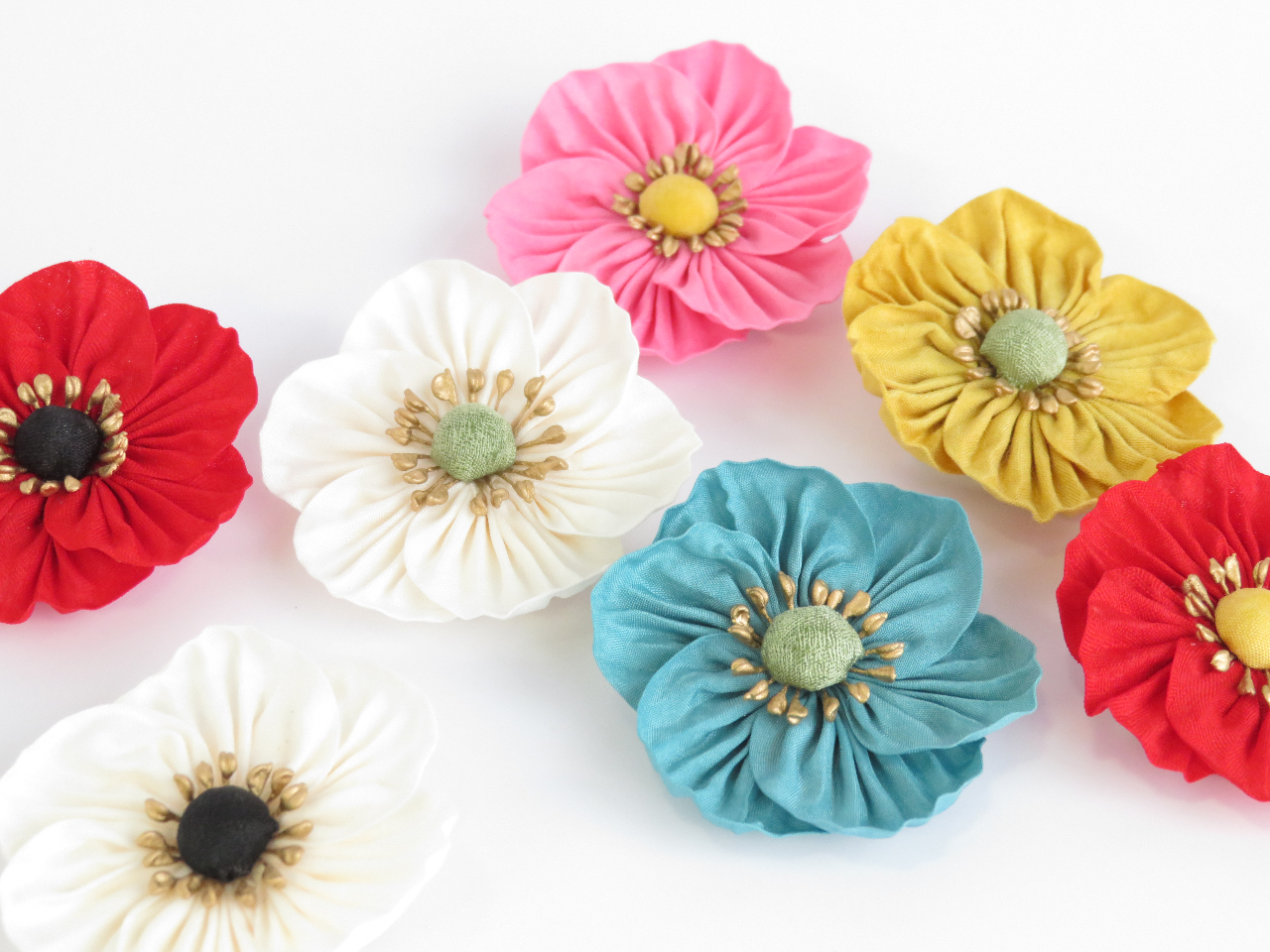着物を素材に日本の伝統技術「つまみ細工」で製作するアネモのブローチ
