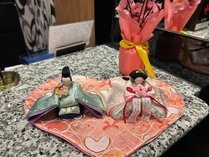 桃の花のピンク色と、小さなお雛様たちが並ぶ愛らしい姿に、スタッフも毎日癒やされています♪