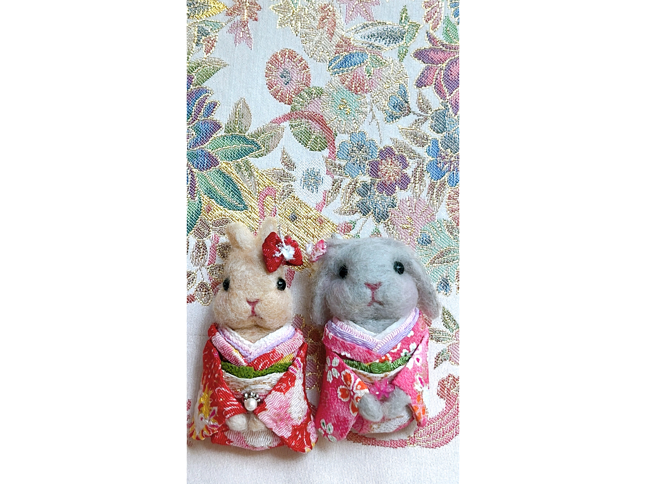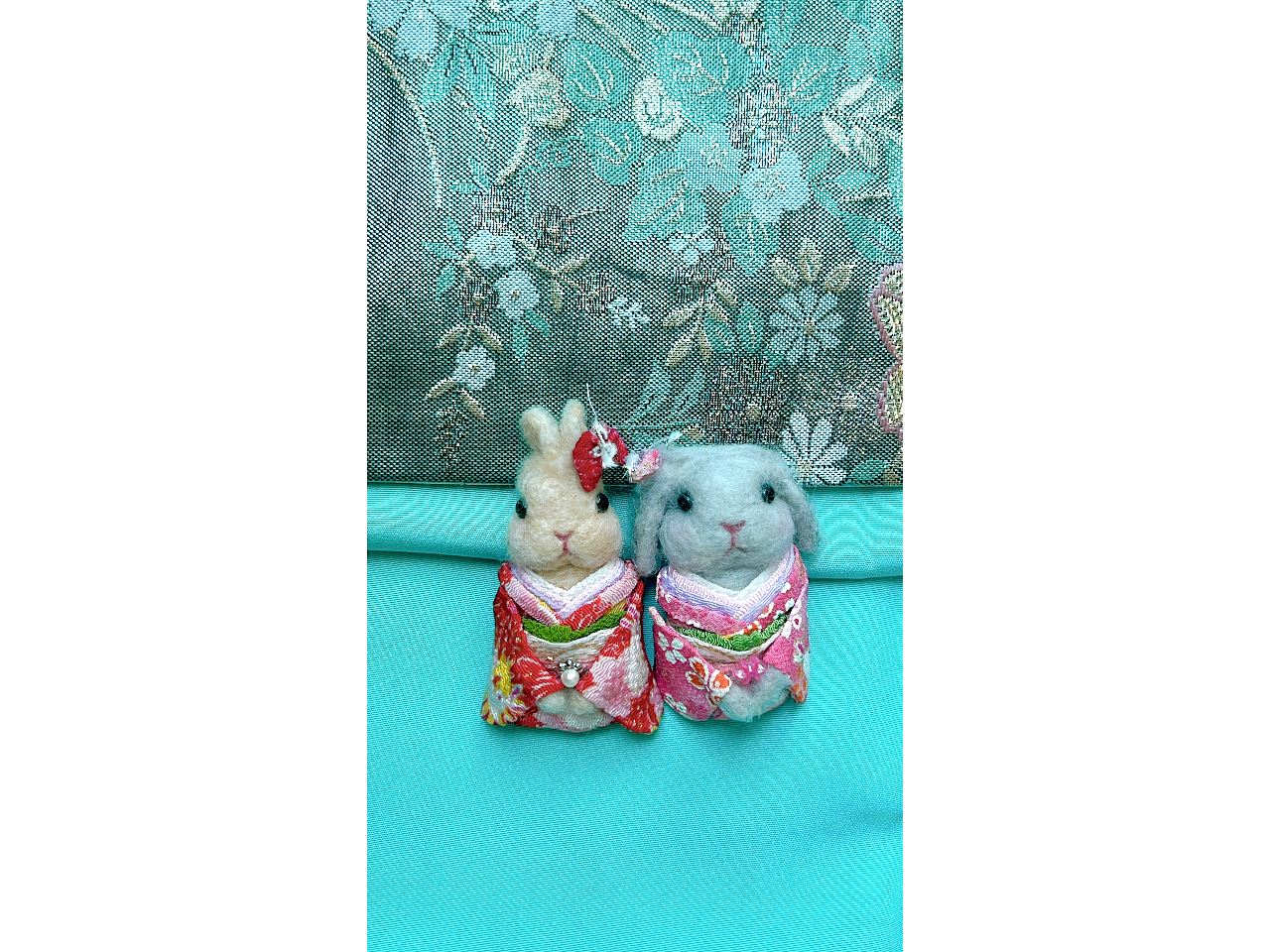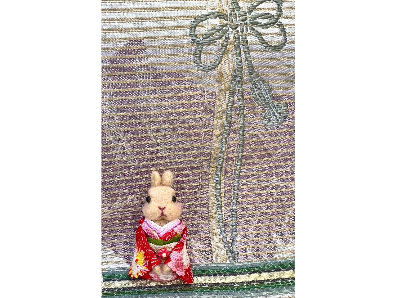 *羊毛フェルトでお顔を作りうさぎ柄のちりめんのお着物(振袖)を