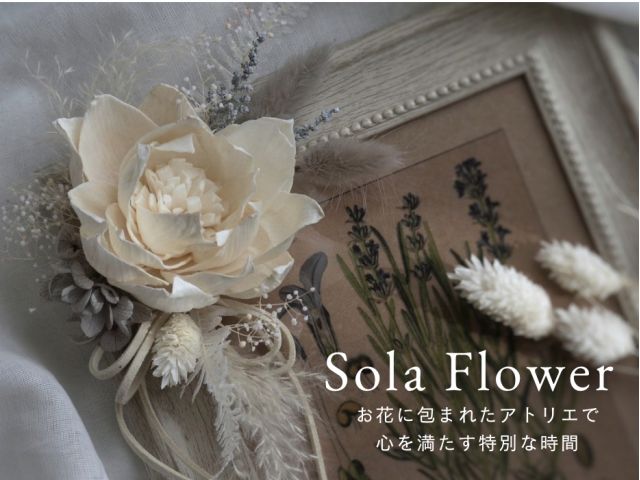 お花に囲まれたアトリエで、初心者でも安心して手作りソラフラワーのフレームアレンジが楽しめます。少人数制で丁寧にサポート。ナチュラルな風合いの作品はプレゼントにも最適です。