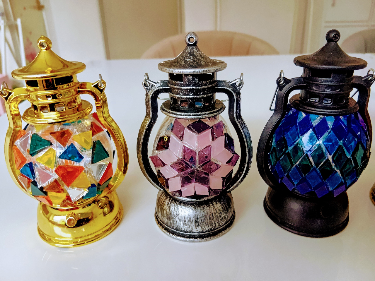 手の平サイズのミニランタンにガラスチップやガラスビーズを貼り付けます。模様や色を決めるのは迷うけど、それが楽しい。