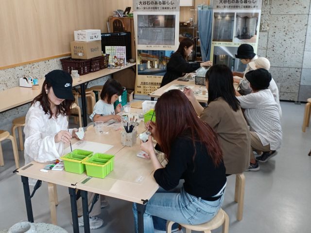 大谷石のコースターに絵を描いたり、大谷石のカエルに色付けをしたり、