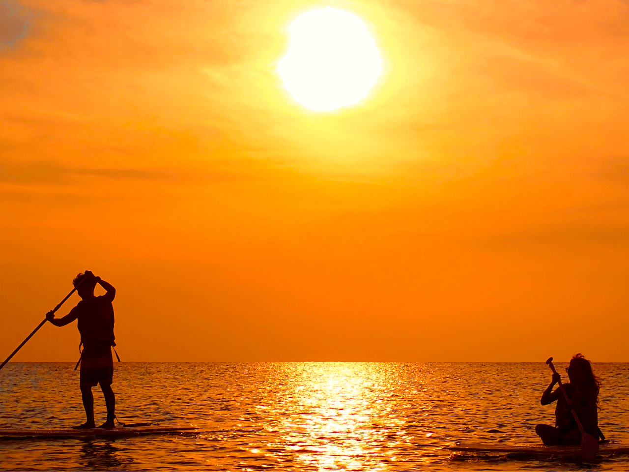 夕暮れ時の海は特別な雰囲気に包まれ、普段とは違うSUP