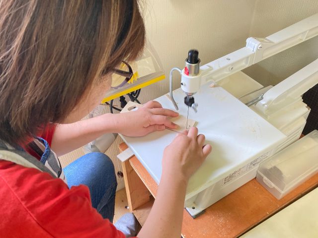 ヒノキ材を糸のこでカット、香りに癒されます。