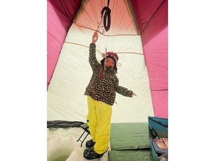 テント内でストーブにあたりながら、ワカサギ釣りを楽しむというユニークな冬のアウトドア体験です。