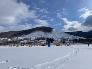 雪景色にテントが並ぶ氷上ワカサギ釣り。