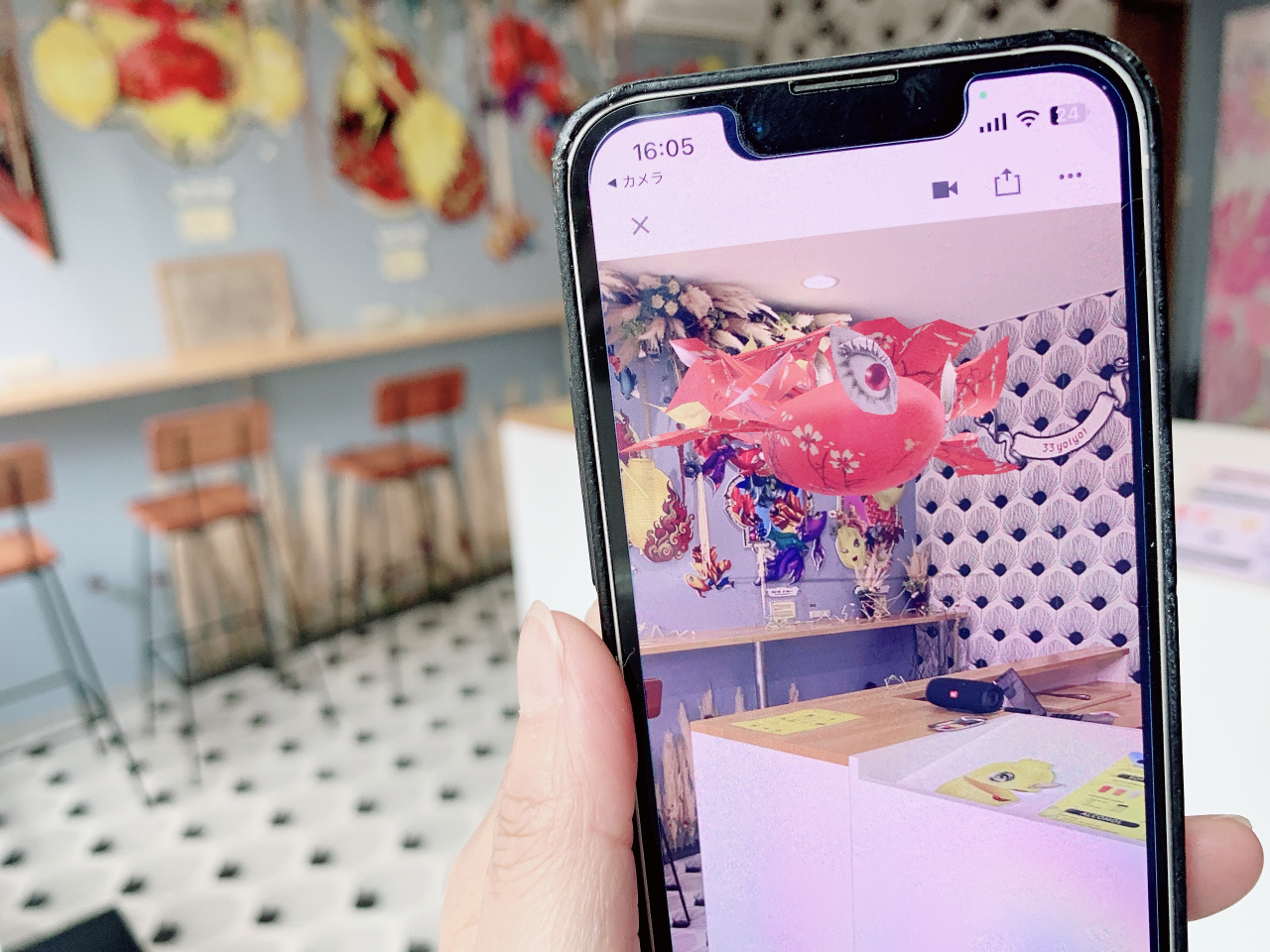 かつて、にし茶屋の入り口にあったとされる門や、芸妓さんに見立てた金魚、幻想的な雰囲気を演出する提灯など、個性あふれるキャラクターが登場します。地面から、空から登場したり、空を優雅な動きで泳ぐ姿など、ARならではの演出で表現。デジタルアートだからこその非現実的な視覚効果が見ものです♪